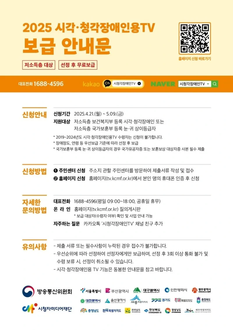 2025년 시각·청각장애인용 TV 보급 사업과 관련하여 궁금한 점이나 도움이 필요한 부분이 있다면, 다음의 공식 문의처를 통해 상세한 안내를 받으실 수 있습니다.