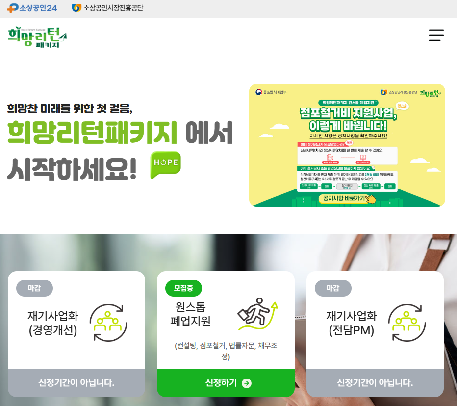 하지만 너무 걱정 마세요. 바로 그런 사장님들을 위해 정부가 든든한 버팀목을 마련했습니다. 바로 '소상공인시장진흥공단 희망리턴패키지'입니다. 제가 지금부터 그 방법을 낱낱이 공개하여 사장님의 무거운 짐을 덜어드리겠습니다.