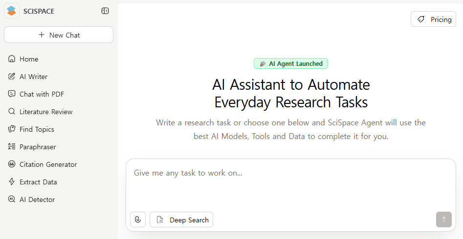 - SciSpace (싸이스페이스): PDF 파일을 드래그해서 올리기만 하면, AI가 단 몇 초 만에 논문의 핵심 내용, 연구 방법, 결론까지 한눈에 보기 쉽게 요약해 줍니다.
